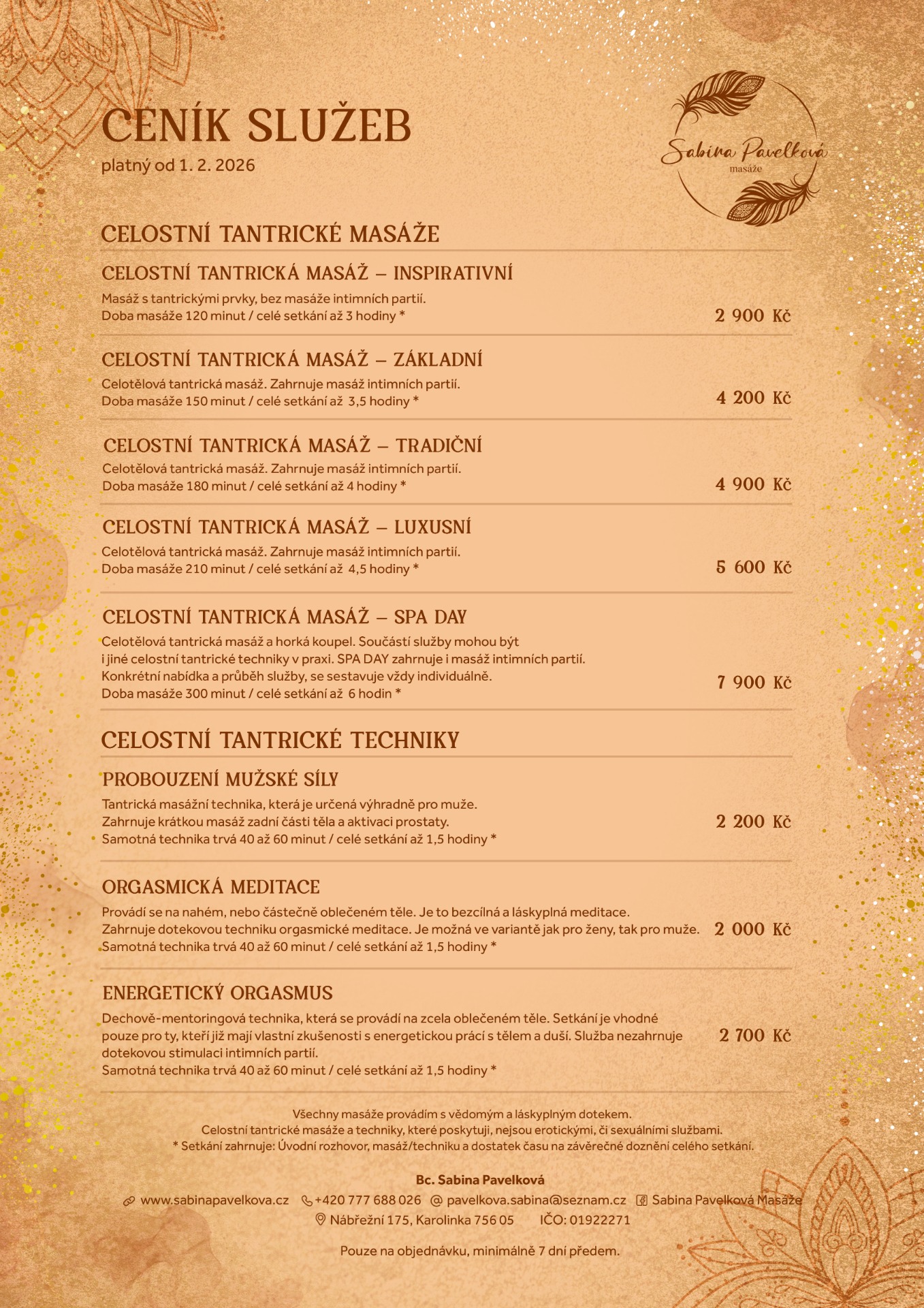 S platností od 15.05.2024, všichni noví klienti, kteří si chtějí u mě rezervovat termín služby, budou vyzváni k uhrazení rezervačního poplatku. V případě individuálních rezervačních masáží se jedná o rezervační poplatek ve výši 500,- Kč, v případě celostních tantrických masáží/technik se jedná o rezervační poplatek ve výši 1000,- Kč.